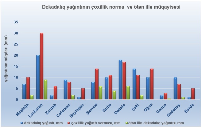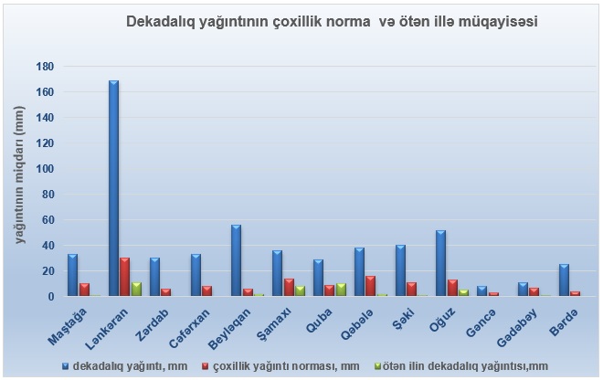 Yağıntının dekadalıq miqdarı ən çox Lənkəranda 169 mm, Beyləqanda 56 mm, Oğuzda və İmişlidə 52 mm, Şəkidə 40 mm, Qəbələdə 38 mm, Şamaxıda və Yevlaxda 36 mm, Balakəndə 35 mm, Zaqatalada 34 mm, Maştağada və Cəfərxanda 33 mm qeydə alınıb.