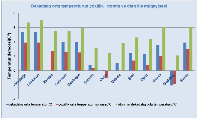 Havanın dekadalıq orta temperaturu Gədəbəydə -2⁰C, Naxçıvanda -0,8⁰C, Şərurda -0,3⁰C, Qubada 0,1⁰C, Şamaxıda 0,8⁰C, Ordubadda, İsmayıllıda və Qəbələdə 1⁰C, Tovuzda, Ceyrançöldə, Qazaxda, Şəkidə, Oğuzda və Zaqatalada 2⁰C, Maştağada, Bərdə-Tərtərdə, Mil-Muğanda, Gəncə-Goranboyda və Lənkəranda 4-5⁰C qeydə alınıb.