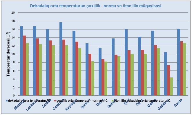 Havanın dekadalıq orta temperaturu Gədəbəydə 10,5⁰C, Qubada və Dağlıq Şirvan bölgəsində 12-13⁰C, Şərurda, Tovuzda və Ceyrançöldə 14C⁰, Şəki-Zaqatala bölgəsində 14-16⁰C, Gəncədə, Şəmkirdə, Lənkəranda, Ordubadda, Zərdabda, Bərdə-Tərtərdə, Goranboyda və Maştağada 16-17⁰C, Mil-Muğanda 16-18⁰C qeydə alınıb.