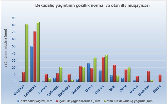 Yağıntının dekadalıq miqdarı ən çox Oğuzda 48 mm, Qəbələdə 30 mm, Gədəbəydə 29 mm, Şəkidə 24 mm, İsmayıllıda 17 mm, Qubada 15 mm qeydə alınıb.